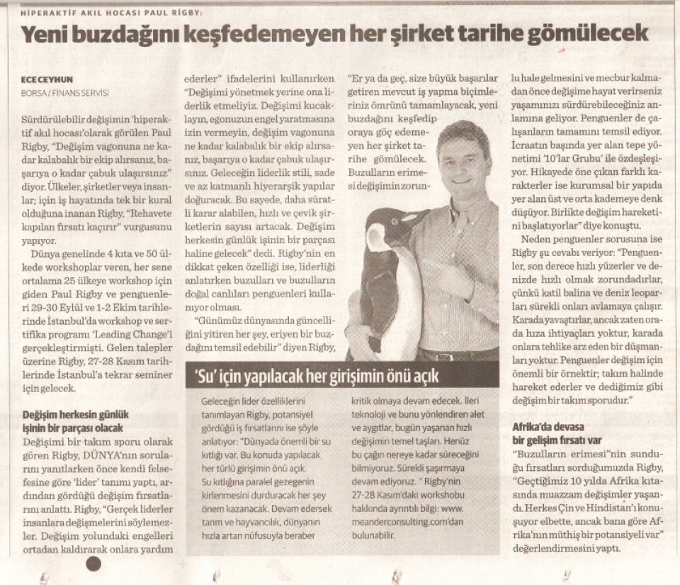 Dünya genelinde 4 kıta ve 50 ülkede workshoplar veren, her sene ortalama 25 ülkeye workshop için giden Paul Rigby ve penguenleri 29-30 Eylül ve 1-2 Ekim tarihlerinde İstanbul’da workshop ve sertifika programı ‘Leading Change’i gerçekleştirmişti. Gelen talepler üzerine Rigby, 27-28 Kasım tarihlerinde İstanbul’a tekrar seminer için gelecek.