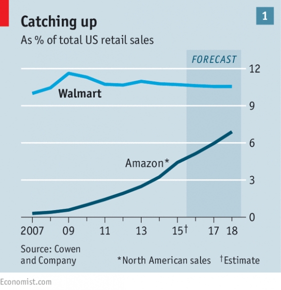 Morgan Stanley verilerine göre, ABD elektronik ticaret hacminin toplam perakende harcamaları içindeki payı %9,3'ten (2014) % 10,4'e (2015) yükseldi. Bu büyümedeki itici güç 2015'te Kuzey Amerika satışlarında %30 büyüme yakalayan Amazon.